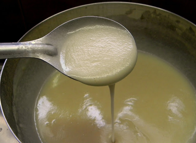 6. Turn the gas off and add the chilled stock and keep stirring continuously to avoid getting any lumps , turn the gas on medium heat and keep stirring till you get a sauce as thick as this , it will get thicker on cooling.